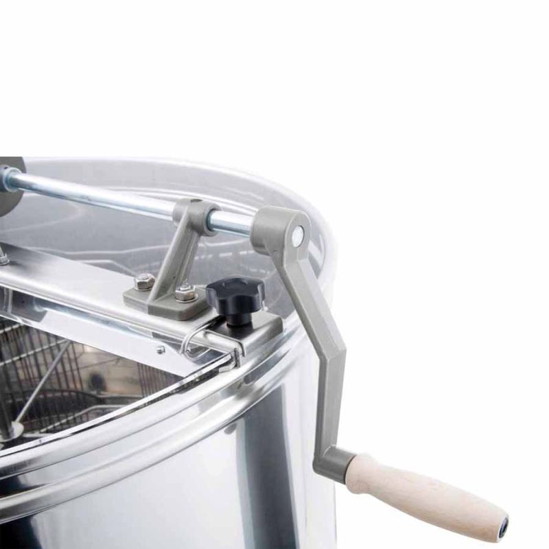 Estrattore per 4 telai, azionamento manuale, con struttura metallica, ruota libera e freno di ritorno. La più moderna tecnologia ci ha permesso di sviluppare un fondo vasca innovativo: la base della vasca è saldata senza giunzioni ed inclinata verso lo scarico. Il rubinetto a compressione in acciaio inossidabile è saldato nel punto più basso possibile per consentire lo svuotamento completo del miele. La pulizia dell'estrattore è semplice. Tutte le parti a contatto con il miele sono realizzate in materiali alimentari approvati. Il coperchio è fissato con cerniere speciali ed è in acrilico trasparente, per permettere l'osservazione del processo di estrazione. La speciale costruzione dei piedini garantisce un'affidabile stabilità dell'estrattore.