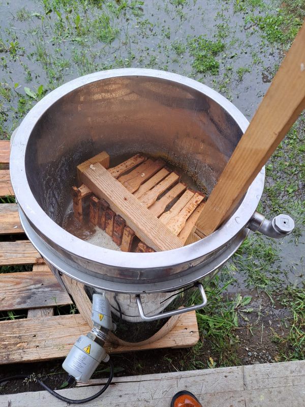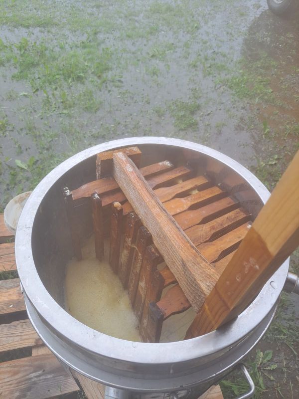 Chiarificatore per cera a triplo mantello con isolamento per l'eliminazione delle spore di Nosema e della peste americana nella cera d'api.Il serbatoio chiarificatore è pensato principalmente per l'uso in apicoltura e per la produzione di candele: