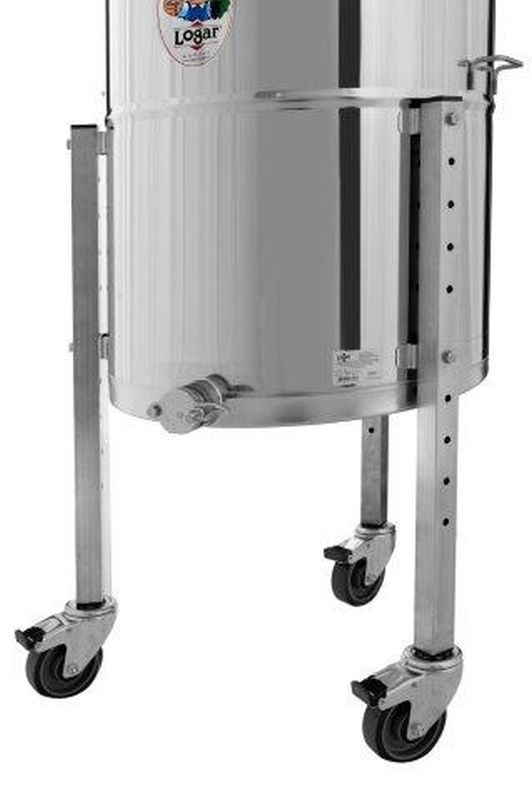 L'altezza dei piedi e le ruote orientabili (con freno) permettono il riempimento di contenitori fino a 40 cm di altezza. Il fondo inclinato con lieve pendenza verso lo scarico garantisce il deflusso quanto più completo possibile del miele. Il fondo è saldato senza giunture, facilitando notevolmente la pulizia. Per filtrare il miele è possibile utilizzare il setaccio adattato Art. 7052.