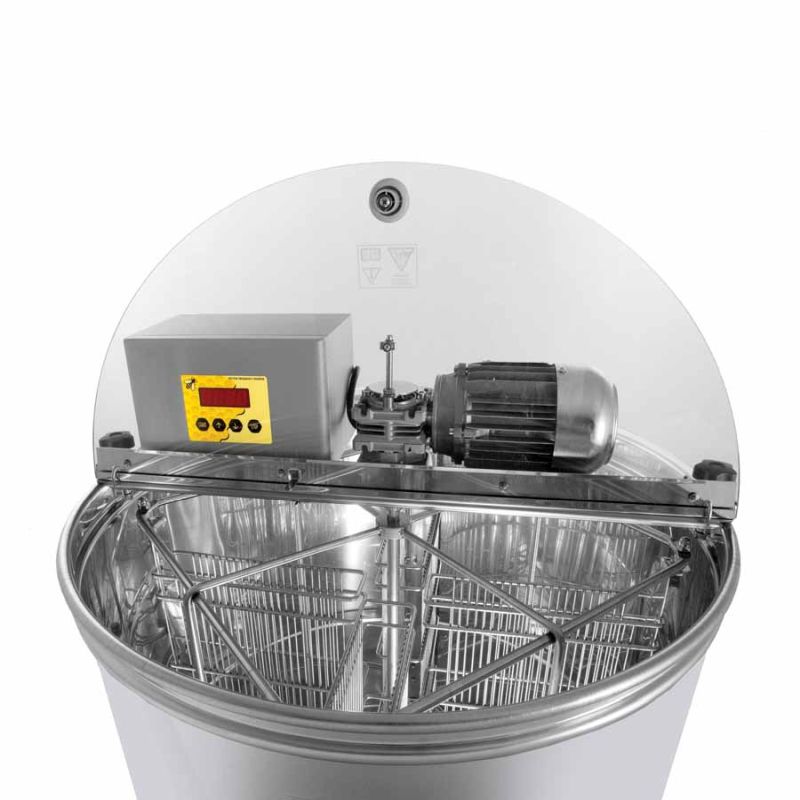 Estrattore autoreversante a 4 telaini con motore 110 W / 230 V, controllo completamente automatico e interruttore di sicurezza che spegne il motore all'apertura del coperchio. La tecnologia più avanzata ci ha permesso di realizzare una soluzione innovativa per il fondo dell'estrattore. Il fondo del tino è saldato senza giunture e inclinato verso lo scarico. Il rubinetto di scarico in acciaio inox è saldato nel punto più basso, in modo che tutto il miele possa defluire dall'estrattore. Tutte le parti dell'estrattore a contatto con il miele sono realizzate in materiali idonei al contatto alimentare. Il coperchio è in acrilico trasparente. Una particolare costruzione dei piedini garantisce all'estrattore un elevato grado di stabilità.