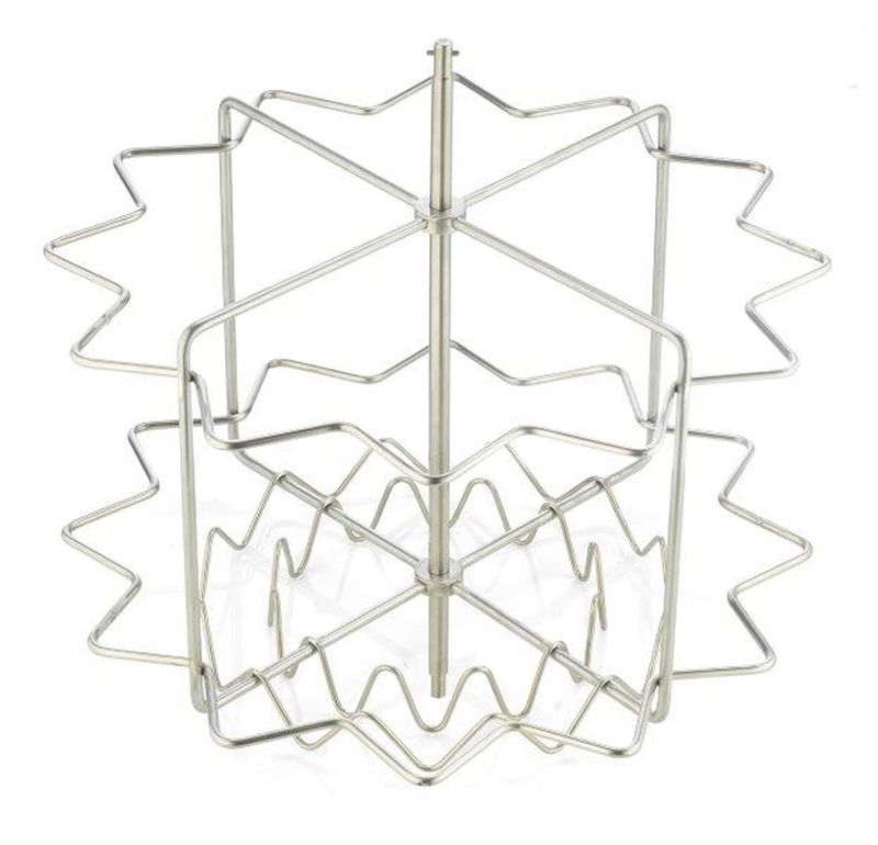 • Il cestello radiale può essere facilmente trasformato in cestello tangenziale inserendo quattro griglie di supporto aggiuntive per il funzionamento tangenziale (Art. Nr. 7761), consentendo l'estrazione di quattro grandi telaini fino a 30 cm di altezza. In questo caso è possibile appendere al cestello una tasca raccoglicera per i tappi di cera (Art. Nr. 7758) in modo che il miele scorra facilmente dai tappi di cera.