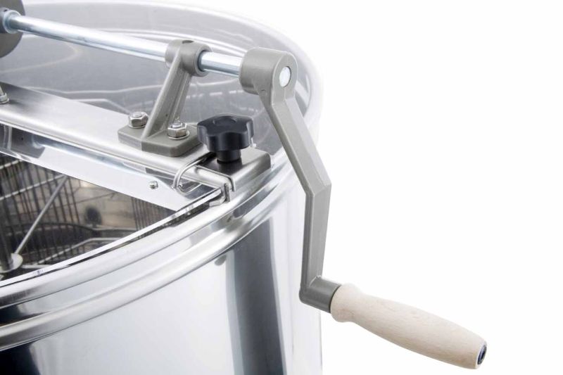 Estrattore radiale 12/8, azionamento manuale in struttura metallica con ruota libera e freno di contropressione. La tecnologia più avanzata ci ha permesso di sviluppare in modo innovativo il fondo dell'estrattore. Il fondo del recipiente è saldato senza giunzioni e inclinato verso lo scarico. Il rubinetto inossidabile è saldato nel punto più basso possibile, in modo che tutto il miele possa defluire dall'estrattore. Tutte le parti dell'estrattore a contatto con il miele sono realizzate con materiali idonei per uso alimentare. Il coperchio è in acrilico trasparente. Una costruzione particolare dei piedini garantisce una stabile tenuta dell'estrattore.