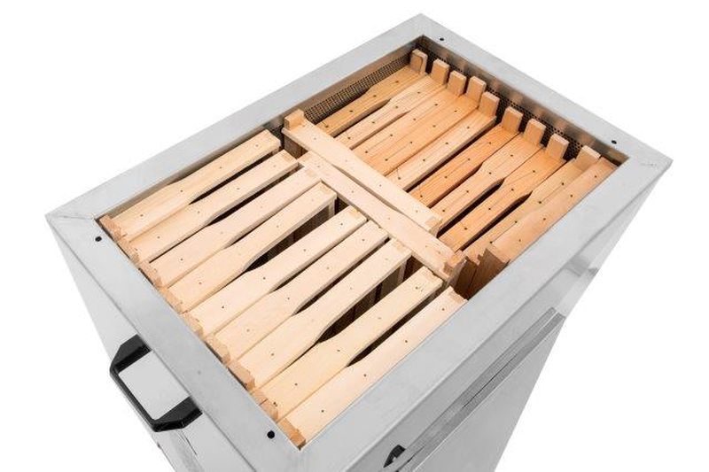 Adatto a: apicoltori con 20–100 famiglie di api. Capacità: ca. 23 telaini (il numero dipende dalla dimensione dei telaini). Dimensioni cestello: 33 × 53 × 49 cm. Dimensioni complessive: 41 × 61 × 85 cm (incl. supporto smontabile).
