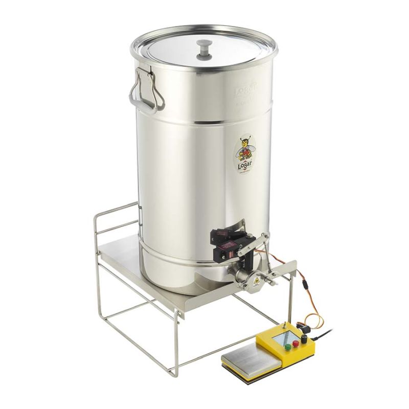 L'impianto di riempimento è montato sul nostro serbatoio da 50 kg con fondo inclinato per garantire un flusso più semplice. Un servomotore montato sulla linea di uscita controlla la chiusura del coperchio del rubinetto a spremitura. La riempitrice è progettata per il riempimento semiautomatico di miele o di altri liquidi con consistenza viscosa.