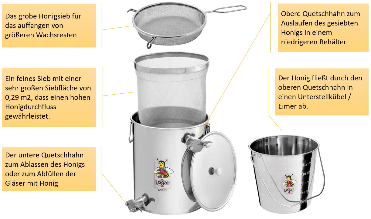 - La combinazione di setaccio grossolano e secchia filtrante si è dimostrata la migliore soluzione per la pulizia del miele durante la smielatura, perciò la raccomandiamo caldamente. Con questa combinazione ottenete miele completamente puro.