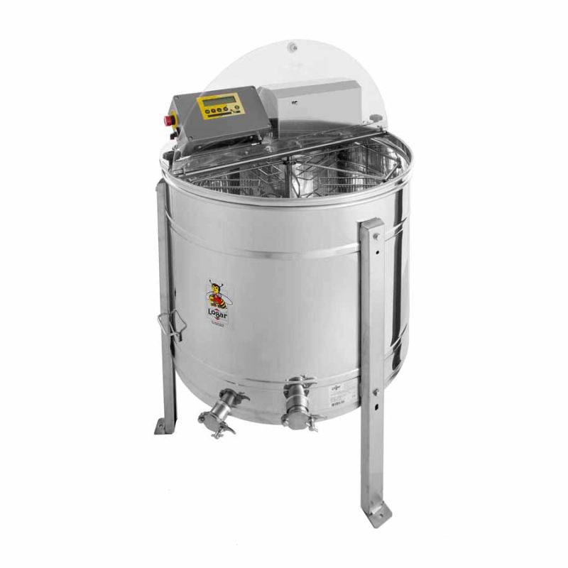 Smielatore a capovolgimento automatico per 4 telai con azionamento elettrico 180 W / 230 V e comando totalmente automatico. Lo smielatore è dotato di un interruttore di sicurezza integrato che spegne automaticamente il motore all'apertura del coperchio. La tecnica avanzata garantisce un fondo del tino saldato senza giunzioni e inclinato verso lo scarico; il rubinetto in acciaio inox è posizionato nel punto più basso affinché tutto il miele possa defluire. Tutte le parti a contatto con il miele sono realizzate con materiali idonei per alimenti. Il coperchio è in acrilico trasparente.